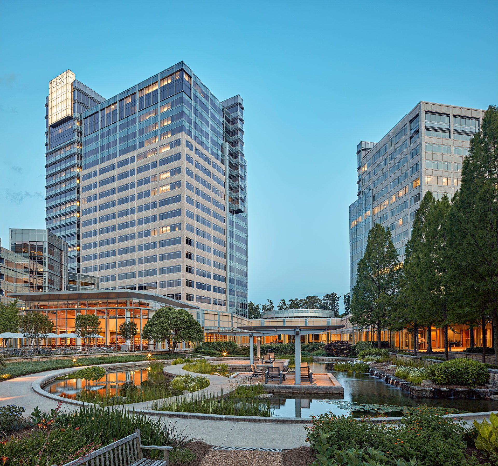 The headquarters for Cox Enterprises is nestled in a serenely wooded site in an otherwise busy section of Atlanta. The 15-year design effort began with a master plan and included a total build-out of four office towers, three parking structures, and employee support space, including a two-level commons building and an entry rotunda to reinforce the company’s desire for employee interaction. A series of central gardens form the core of the master plan and its complex of buildings. Colored spandrel glass, clear vision glass and expressed aluminum sunscreens echo the high-tech nature of Cox’s core business, while limestone adds a warm natural aesthetic.